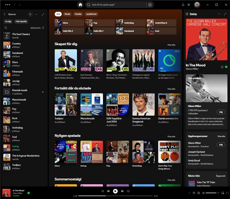 Jag spelade förstås musik under samlingen före halv tio. Just nu blir det varianter på -Radio i Spotify. Exempel på sökningar i Spotify: Glenn Miller-Radio, André Rieu-Radio, Vikingarna-Radio osv. Du hittar då spellistor där det står Spellista Spotify. Då får du en 2-timmars spellista med musik typ det du valde Glenn Miller, Vikingarna, André Rieu eller annat.